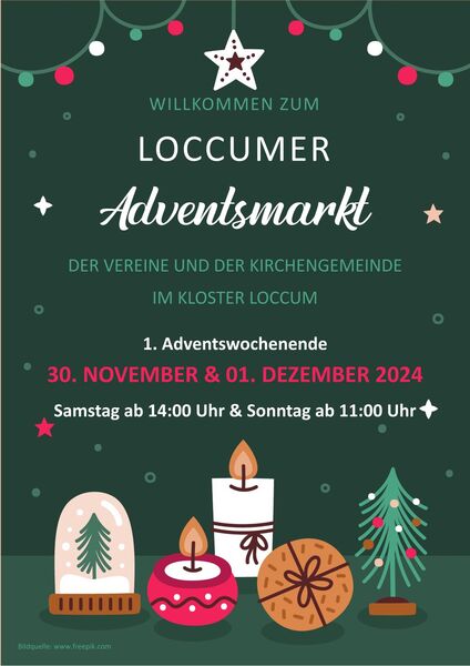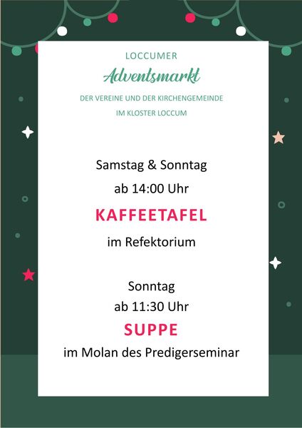 Im besonderen Ambiente von Kirche und Kreuzgang sowie draußen zwischen Torhaus, Kirche, Konventsgebäude und Kösterhaus erwartet die Besucherinnen und Besucher eine große Vielfalt an Ständen: Kunsthandwerk, Advents- und Weihnachtsschmuck, Textilien, Marmeladen, Seifen, Schmuck, erlesene Brände, süße und herzhafte Leckereien und vieles mehr. Und natürlich dürfen weder die Loccumer Kaffeetafel im Refektorium fehlen noch Klassiker wie Glühwein, Bratwurst und kalte Getränke.