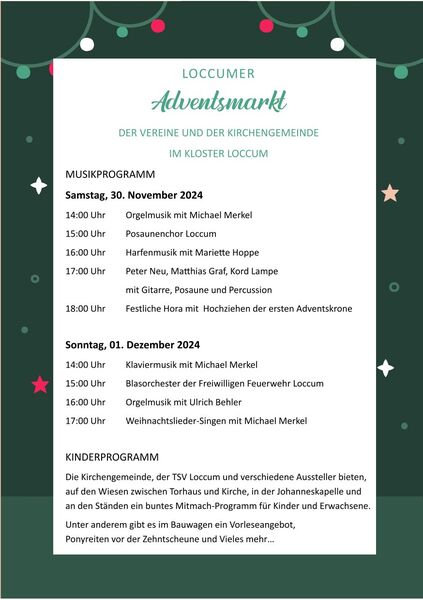 Zum zweiten Mal nach 2022 gibt es im Kloster Loccum einen gemeinsamen Adventsmarkt der Kirchengemeinde, der Loccumer Vereine und Gruppierungen und des Klosters. „Nachdem der erste gemeinsame Adventsmarkt ein so wunderbares Erlebnis war, soll es dieses Jahr eine Wiederholung geben“, sagt Anne Sator vom Organisationsteam. Mit mehr als 50 Ausstellern wird der Markt am 1. Adventswochenende einer der größten in der Region sein. Geöffnet hat er am Samstag, 30. November, ab 14 (im Kreuzgang schließt der Markt zum Abendgebet in der Kirche um 18 Uhr, draußen ist länger geöffnet) und am Sonntag, 1. Dezember, von 11.30 bis 18 Uhr.