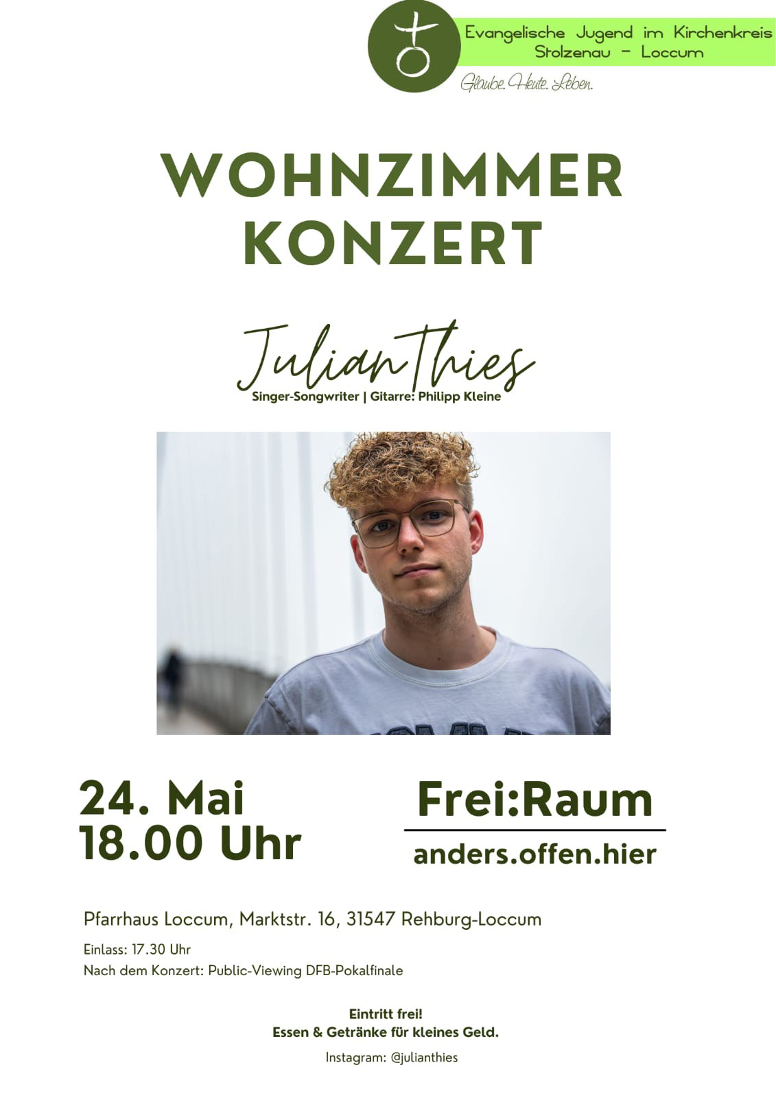 Die Evangelische Jugend im Kirchenkreis Stolzenau-Loccum lädt ein zu einem Wohnzimmerkonzert mit dem Songwriter Julian Thies.