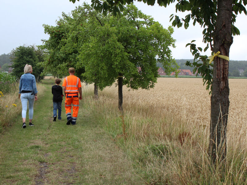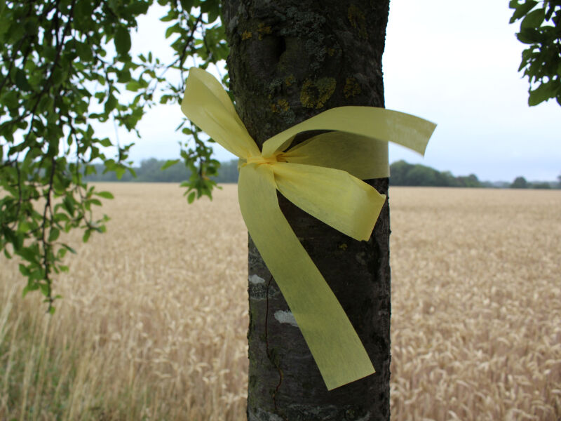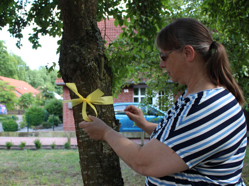 Auf dieses Projekt sind Rehburg-Loccums FoodTeiler aufmerksam geworden, haben bei der Stadt dafür geworben und haben die Bäume mit Bändern verziert. Info-Material zu den Gelben Bändern liegt in den Teilstationen der FoodTeiler in Loccums und Rehburgs Gemeindehäusern aus.